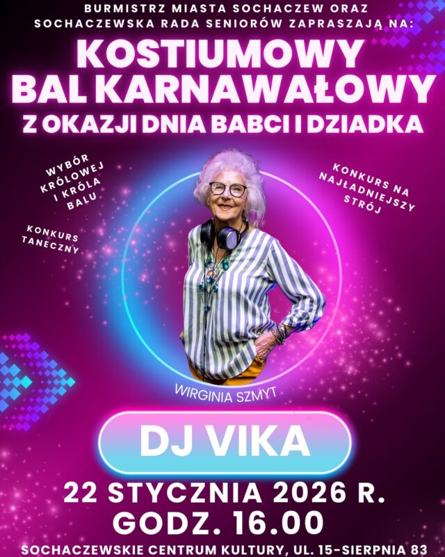 Z okazji Dnia Babci i Dnia Dziadka Burmistrz Sochaczewa oraz Sochaczewska Rada Seniorów serdecznie zapraszają na niezwykłe wydarzenie pełne radości, tańca i uśmiechu – Kostiumowy Bal Karnawałowy.